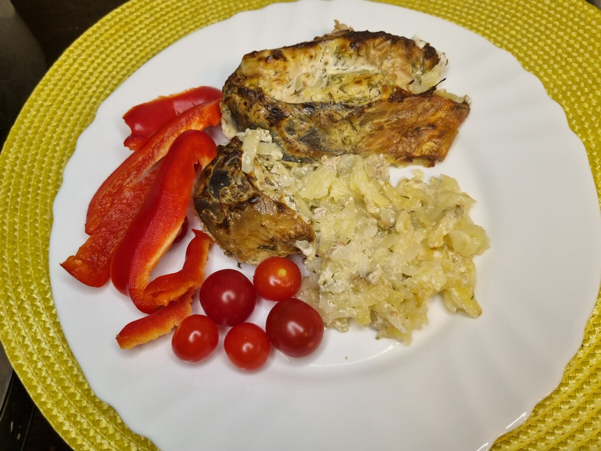 Ну вот еще один вкусный, рыбный рецепт. Рыбных рецептов у меня мало, так что пусть будет. Рыбу режем на стейки. Лук режем тонкими полукольцами. Сметану выкладываем в глубокую миску, добавляем соль, перец, укроп, лук и перемешиваем. В соус выкладываем стейки горбуши, перемешиваем и оставляем минут на 30, час помариноваться. Выкладываем всё в форму, закрываем пергаментом и отравляем в духовку минут на 30. Потом убираем пергамент и даем минут 5 рыбе подрумяниться.