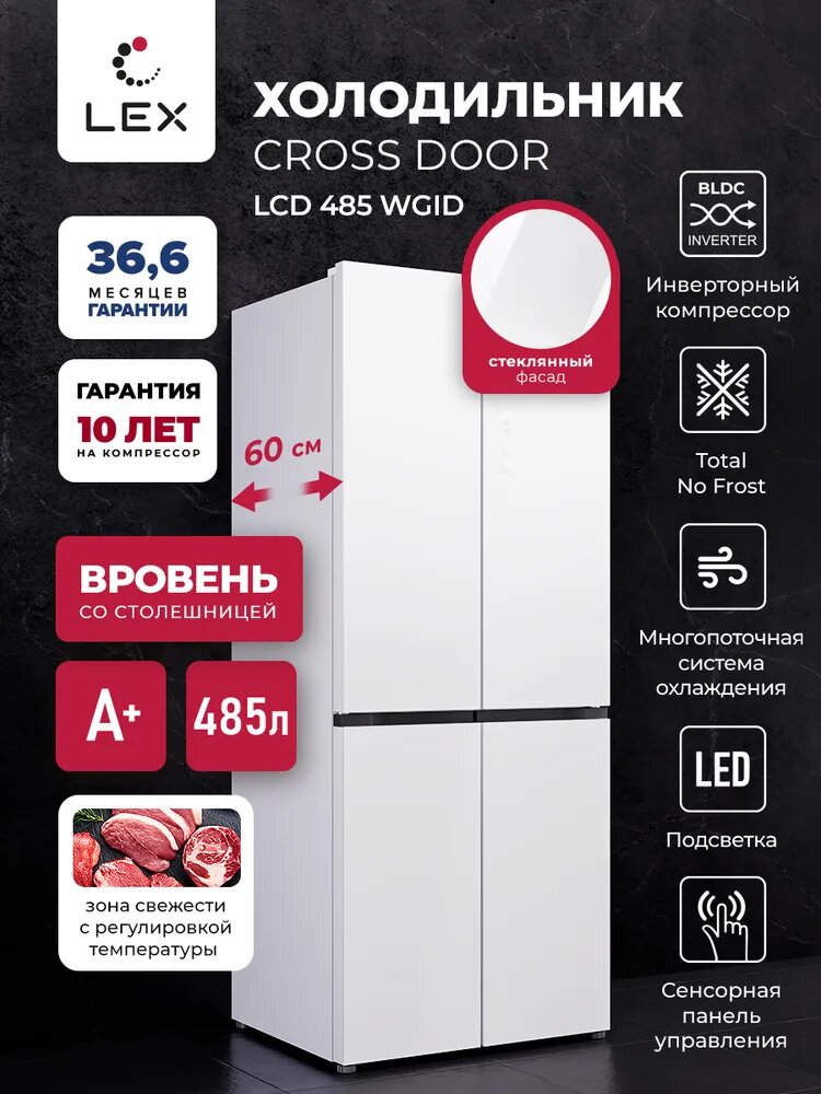 Холодильник LEX LCD485 Cross Door с инверторным компрессором — это современное решение для тех, кто ценит комфорт, надежность и эффектный дизайн. Модель со стеклянными дверцами станет настоящим акцентом в интерьере кухни и подчеркнёт её стиль. Благодаря тому, что вентиляция расположена в нижней части, холодильник можно устанавливать вплотную к мебели или встраивать в нишу — он отлично подойдёт для современных кухонных пространств. Холодильник разделён на 3 независимые камеры с отдельными контурами охлаждения и системой Total No Frost, что полностью избавляет от необходимости ручной разморозки. Общий полезный объём составляет 418 литров, из которых: Внутреннее пространство организовано максимально удобно: Отдельные зоны с регулировкой температуры и влажности позволяют дольше сохранять свежесть овощей, фруктов и других продуктов. Также предусмотрены функции суперохлаждения и суперзаморозки, которые быстро доводят температуру до нужного уровня. Современное сенсорное управление с дисплеем