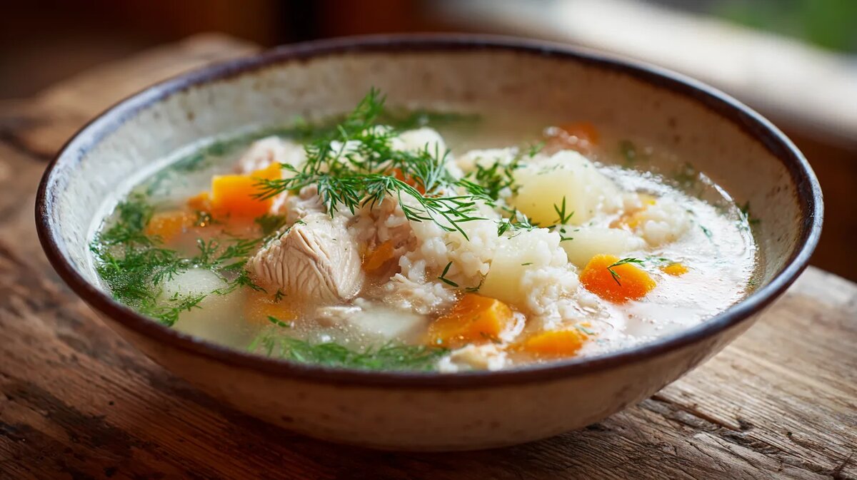 Варите ещё 10 минут до готовности риса. Добавьте лавровый лист и укроп, снимите с огня и дайте настояться под крышкой 10–15 минут. 👉 Полный рецепт с пошаговыми фото: