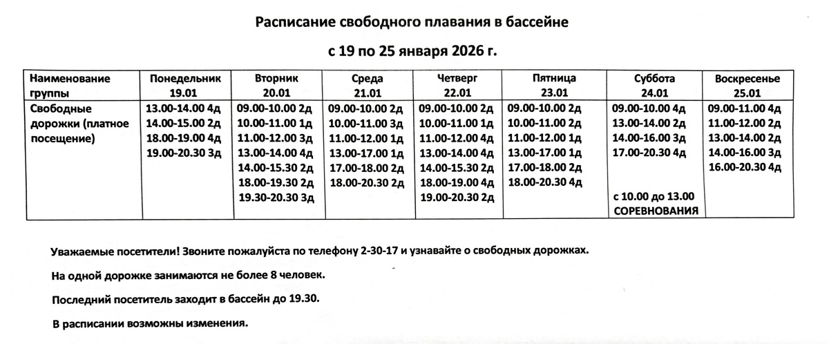 Запустил расписание свободного посещения бассейна ФОК "Уралец" на следующую неделю — с 19 по 25 января. Это хорошая новость для всех любителей плавания и тех, кто хочет поддерживать форму или просто расслабиться. Согласно правилам, на каждой дорожке допускается нахождение не более 8 человек, что позволяет поддерживать комфортные условия и соблюдать меры безопасности. Обратите внимание, что последний вход в бассейн разрешён до 19.30, поэтому планируйте свой визит заранее, чтобы успеть насладиться бассейном. Важно помнить, что расписание может подвергаться изменениям, поэтому для получения актуальной информации рекомендуется связаться с администрацией по телефону 2-30-17. Так вы сможете быть уверенными, что ваше посещение бассейна пройдет без неожиданных сюрпризов.