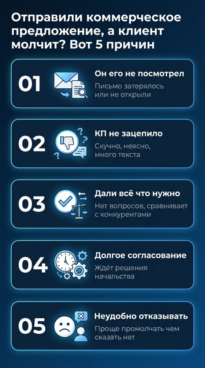 👇 Отправили коммерческое предложение (КП)… Прошёл день, два… Клиент не пишет и не звонит. Больная тема, знакомая многим. Давайте разберём, почему так бывает и что с этим делать. ❗️Возможные причины, почему клиент молчит после получения коммерческого предложения: 1️⃣ Он его не посмотрел Да, бывает – письмо с КП затерялось, или у клиента руки не дошли открыть файл. Не все такие организованные, как мы хотим. 2️⃣ КП не зацепило Открыл, пролистал – скучно, неясно, много текста. Решил “потом гляну подробнее” (то есть никогда) или “что-то не впечатляет, не буду отвечать”. 3️⃣ Вы дали всё, что нужно, и у клиента нет вопросов Принял к сведению и пошёл сравнивать с конкурентами. Отвечать не посчитал нужным — нет формального повода. 4️⃣ Нужен длительный внутренний согласовательный процесс Например, он передал КП начальству, а там неделю совещаются. Ваш клиент реально не может ничего ответить – ждет решения сверху. 5️⃣ Неудобно отказывать Ваше предложение не подошло, но человеку нело