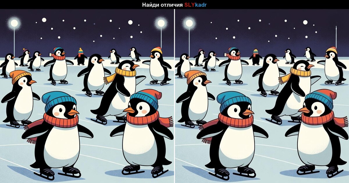 Сегодня предлагаем немного зимнего настроения и задание на внимательность. Весёлые пингвины вышли на лёд, но среди двух почти одинаковых картинок спрятались отличия. Сможете ли вы заметить их все — шапки, шарфы или мелкие детали? Удалось ли вам найти все отличия? 🐧