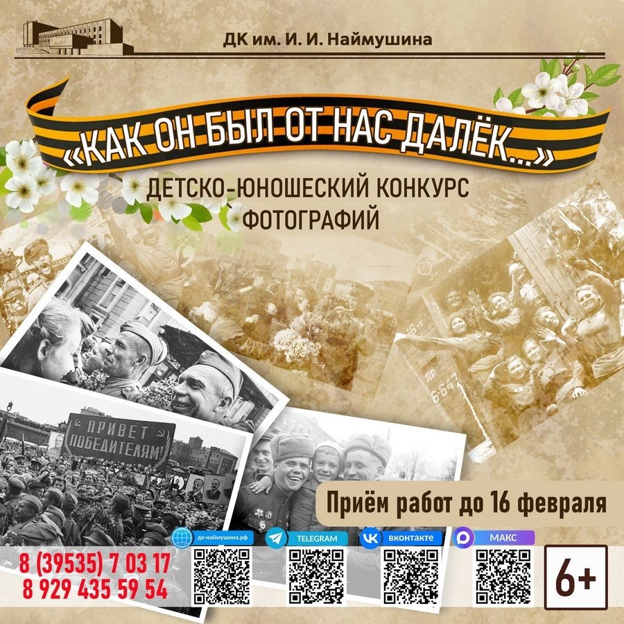 И. Наймушина приглашает юных участников от 6 до 18 лет принять участие в конкурсе фотографий! Это уникальная возможность поделиться с миром фотографиями времён Великой Отечественной войны или современными снимками предметов фронтовой жизни, памятников, мест памяти и многое другое. Прием работ продолжается до 16 февраля 2026 года – не упустите шанс оставить свой след в сохранении памяти о Великой Победе! Условия участия указаны в Положении о проведении Конкурса: https://дк-наймушина.рф/DOC/metod/2026/polojenie_kakonbilotnasdalek.pdf