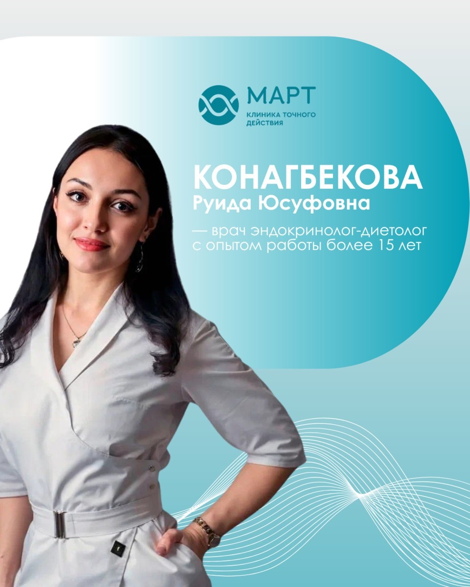 »!💙 С 23 января в нашей клинике начинает приём Конагбекова Руида Юсуфовна – специалист с опытом работы более 15 лет. Доктор - выпускница Астраханского ГМУ, прошла ординатуру по эндокринологии в СЗГМУ им. Мечникова и регулярно повышает квалификацию, специализируясь на актуальных вопросах эндокринологии и клинической диетологии. Руида Юсуфовна оказывает помощь при следующих заболеваниях: - заболевания щитовидной железы (гипотиреоз, тиреотоксикоз, узловой зоб), - сахарный диабет всех типов и инсулинорезистентность, - проблемы с весом (от ожирения до дефицита массы тела с индивидуальным подбором диетотерапии). Также в сферу компетенции врача входят патологии гипофиза и надпочечников, гормональные нарушения у мужчин и женщин, остеопороз и заболевания паращитовидных желез. Записаться на приём можно по телефону +7 (812) 308-00-18 или на сайте: https://martclinic.ru/endokrinolog