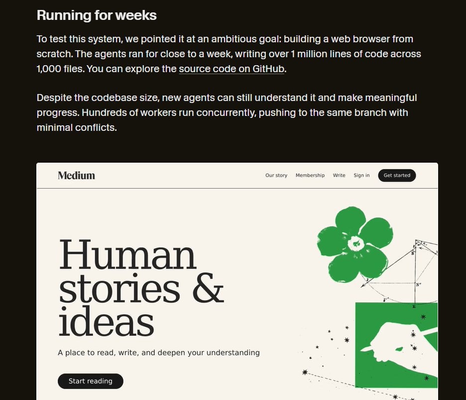 Команда Cursor провела масштабный эксперимент и запустила сотни скоординированных ИИ-агентов, которые без участия людей написали более 1 млн. строк кода и собрали полноценный браузер менее, чем за 7 дней, а также эмулятор Windows 7 и клон Excel. В основе проекта лежала иерархическая структура: планировщики ставили задачи, исполнители писали код, а валидаторы проверяли результат. В основе лежали GPT-5.2 и Claude Opus 4.5. А если вы давно хотели попробовать Cursor, но не хотели отдавать $20/мес, рекомендуем попробовать нашего агента — Lama API. 👋 Lama AI — #лама_news