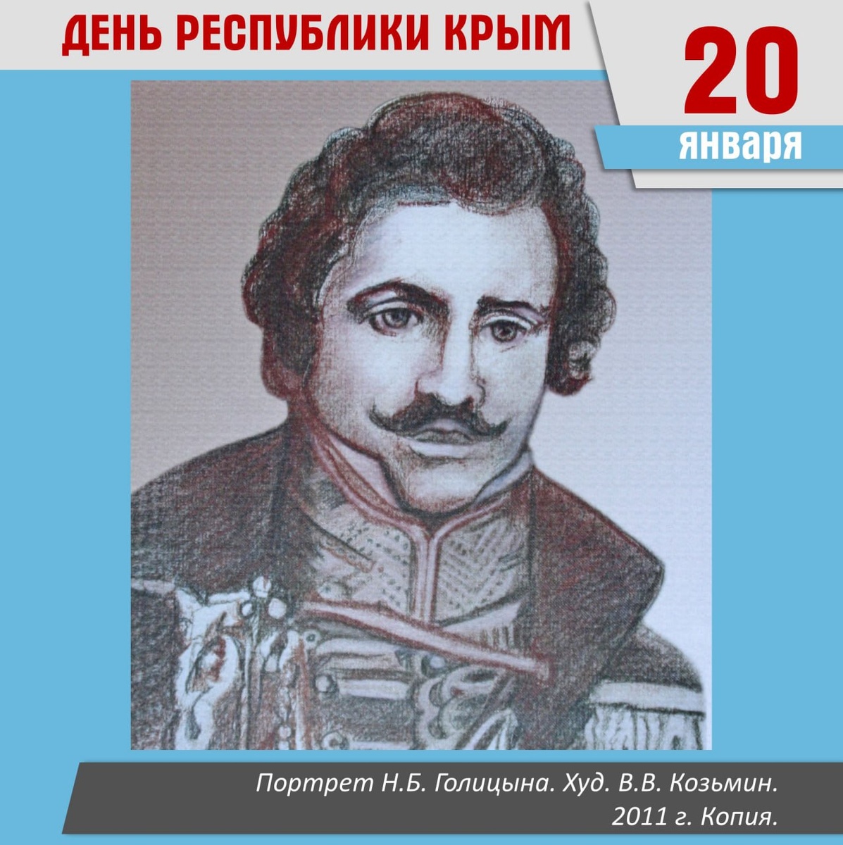 Ежегодно 20 января отмечается День Республики Крым, который был установлен в 2009 г. и подтвержден Законом Республики в 2014 г. Крым - место соединения древнейших культурных традиций. Его история и природные особенности уникальны. Жизнь многих выдающихся уроженцев Белгородчины была тесно связана с Крымом. Князь Николай Борисович Голицын, живший в Новооскольском уезде, возглавлял 48-ю Белгородскую дружину, принимавшую активное участие в Крымской войне 1853-1856 гг. Никодим Павлович Кондаков, уроженец Чернянского района, историк византийского и древнерусского искусства, в конце 1880-х гг. руководил раскопками Археологической комиссии в Херсонесе. Владимир Николаевич Любименко, уроженец с. Вейделевка, ботаник, член-корреспондент Российской Академии наук, в 1907-1913 гг. руководил лабораторией в Никитском ботаническом саду в Ялте. Михаил Алексеевич Курбатов, уроженец Белгорода, скульптор, художник, муляжист, очень любил Крым. В фондах БГИКМ хранится немало этюдов с видами полуострова.