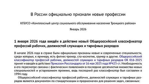 профессий рабочих, должностей служащих и тарифных разрядов В начале 2026 года в стране были официально признаны новые и современные специальности, среди которых, к примеру, есть фитнес-тренер, спа-косметик, грумер и другие. Общероссийский классификатор профессий рабочих, должностей служащих и тарифных разрядов ОК 016-2025 принят и введён в действие Приказом Росстандарта от 16 мая 2025 года №423-ст. Необходимость в его пересмотре связана с фактическим появлением в последние десятилетия множества новых специальностей и устареванием прежних, ведь последний раз классификатор был составлен в 1994 году. Общероссийский классификатор профессий рабочих, должностей служащих и тарифных разрядов является документом по стандартизации и предназначен для решения задач, связанных: Структура документа нового классификатора не изменена, в нём по-прежнему есть два основных раздела: «Профессии рабочих» и «Должности служащих». В докуме