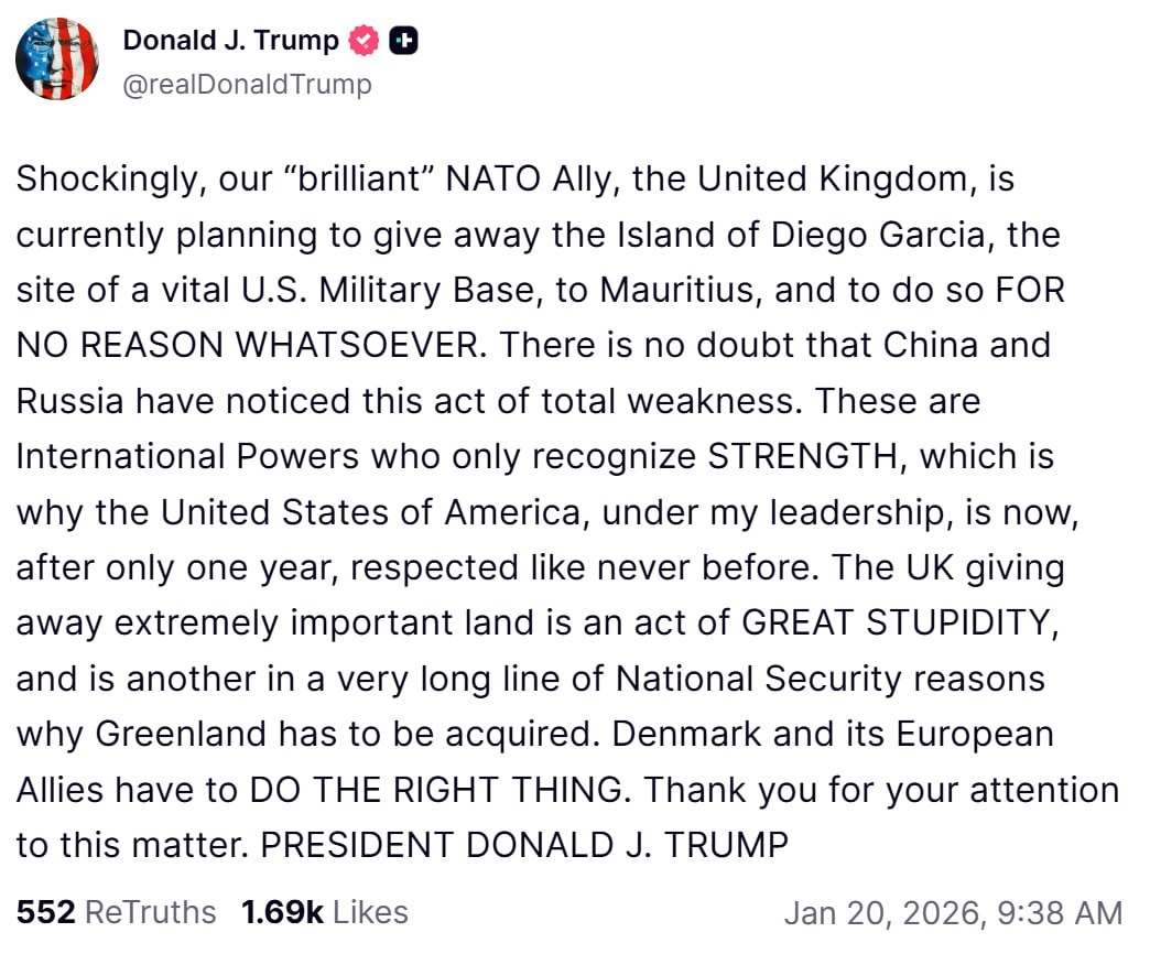расположения жизненно важной военной базы США, Маврикию, причём БЕЗО ВСЯКИХ НА ТО ПРИЧИН. Нет никаких сомнений в том, что Китай и Россия заметили этот акт абсолютной слабости. Это мировые державы, которые признают только СИЛУ, и именно поэтому Соединённые Штаты Америки под моим руководством всего за один год стали пользоваться таким уважением, как никогда прежде. Передача Соединённым Королевством чрезвычайно важной земли — это акт ВЕЛИЧАЙШЕЙ ГЛУПОСТИ и ещё одна из длинной череды причин, связанных с национальной безопасностью, по которым необходимо приобрести Гренландию. Дания и её европейские союзники должны ПОСТУПИТЬ ПРАВИЛЬНО. Благодарю за внимание к этому вопросу. 👆Дональд (всевидящий) Трамп. 🟪Читай в Max | 🚀Читай в Telegram | 🥰Смотри на RUTUBE