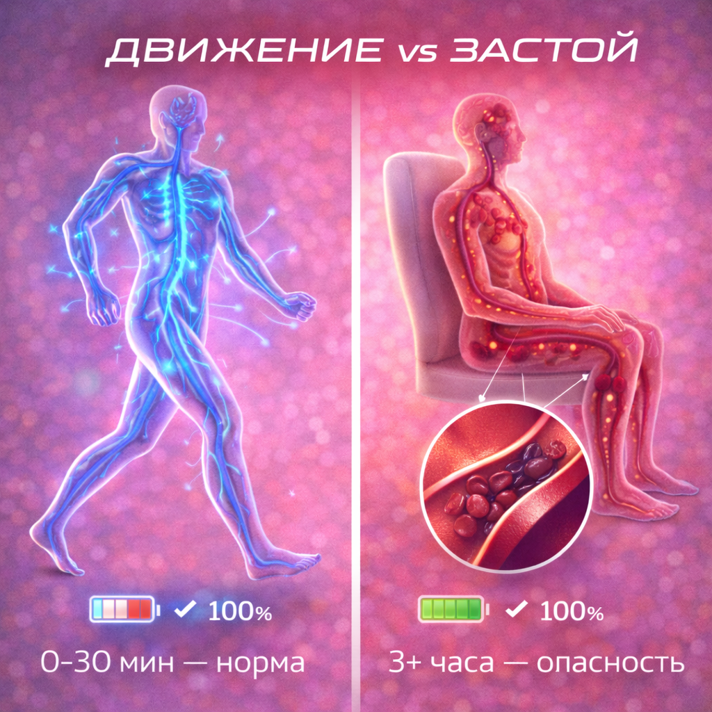 Результат: долго сидел или лежал в одном положении → кровь застоялась → онемение, тяжесть, головокружение. А в худшем случае — тромбоз, инсульт, падение с переломом.