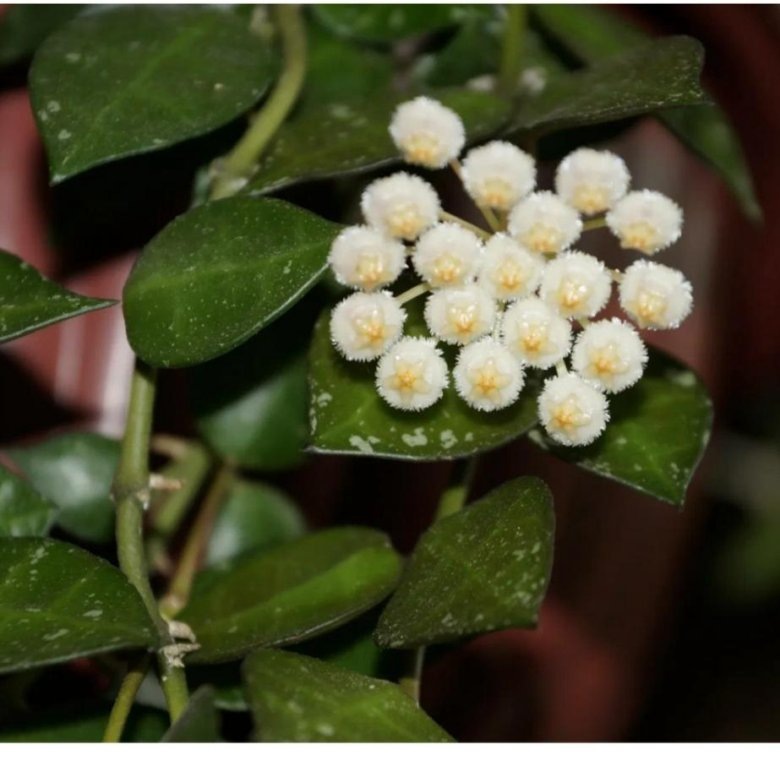 Это вьющееся или ампельное растение родом из тропических регионов Юго-Восточной Азии, где оно произрастает в условиях высокой влажности и рассеянного света. Название "Эскимо" растение получило благодаря характерной окраске листьев - на плотных, слегка вогнутых листовых пластинах присутствуют серебристо-белые пятна и штрихи. Листья небольшие, мясистые, с выраженной текстурой, за счет чего растение выглядит декоративно даже вне периода цветения. Цветение хойи лакунозы Эскимо считается одним из главных ее достоинств. Соцветия зонтичные, компактные, состоящие из множества мелких цветков кремово-белого или слегка желтоватого оттенка. Цветки обладают сильным, сладким ароматом, который особенно интенсивно ощущается в вечернее и ночное время. Запах часто описывают как смесь ванили и пряных нот. При благоприятных условиях растение способно цвести несколько раз в год, причем цветоносы не следует удалять после цветения, так как именно на них формируются новые соцветия. Уход за хойей Эскимо в дом