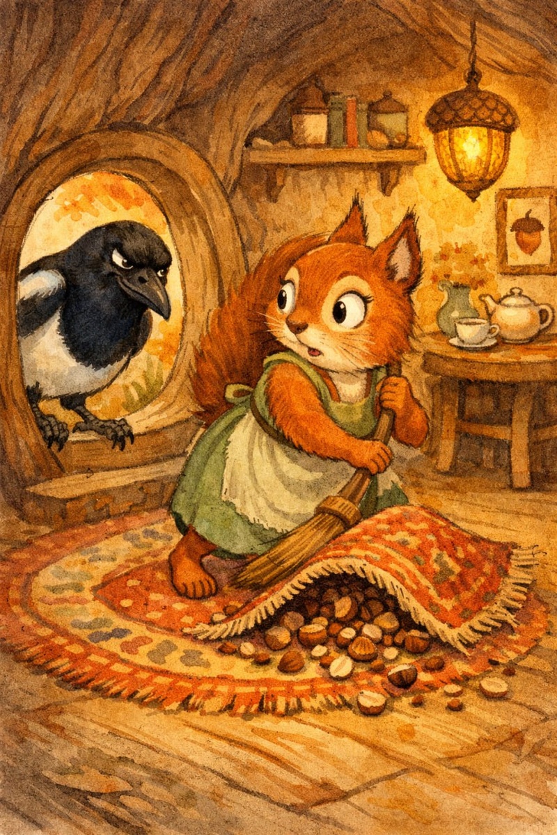 " Жила-была в лесу Белка, которая очень любила грызть орехи, но ещё больше она любила идеальный порядок в своем дупле. Каждый раз, когда она хотела поесть, она сначала закрывала шторы, запирала дверь и только потом доставала орехи. Однажды к ней постучалась Сорока-соседка: - Белочка, почему ты всегда прячешься, когда ешь? Ведь вместе веселее! - Ох, нет, - вздохнула Белка. - Если я буду грызть орехи при тебе, скорлупки разлетятся по полу. Ты зайдешь, посмотришь и скажешь: "Какой у этой Белки бардак! Неряха!" Сорока удивилась: - С чего ты взяла? Я бы подумала, что ты просто наслаждаешься обедом. Но скажи мне честно, когда ты прилетаешь ко мне в гнездо и видишь мои веточки и перышки, разбросанные после сна, что ты думаешь? Белка тут же вспыхнула: - Ну что ты! Я ничего такого не думаю! Мне все равно, как живут другие, меня волнует только мое дупло! Честно-честно! Сорока хитро прищурилась и ответила: - Ты обманываешь не меня, а себя, подруга. Тот, кто не видит грязи в чужом доме, не бо