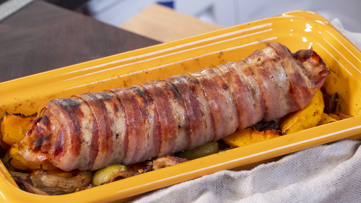 Ингредиенты: - Свиная вырезка — 1 шт - Тыква — небольшой кусочек - Вешенки — по вкусу - Сырокопчёный бекон — тонкие ломтики - Курага — 3–4 шт - Оливки — 4–5 шт - Красный лук — 1 шт - Чили перец — маленький кусочек - Аджика грузинская — несколько щепоток - Лимон — маленький кусочек (сок) - Чеснок — 2 зубчика - Горчица зерновая сладкая — по вкусу - Раст. масло, соль, перец Приготовление: 1. Тыкву нарезать дольками + вешенки + курага + оливки + красный лук + чили + аджика + чеснок + лимонный сок + масло → перемешать и запекать в форме при 200°C (верх/низ) ~20–25 мин. 2. Вырезку очистить, посыпать перцем, обжарить на вытопленном жире по 10–15 сек с каждой стороны (можно горелкой сверху). 3. Смазать сладкой горчицей. 4. Завернуть в тонкий бекон (на пергаменте), шов вниз. 5. Выложить мясной рулет на запечённые овощи швом вниз → допекать 10 мин при 200°C. 6. Дать отдохнуть 5 мин, нарезать кружочками и подавать с овощами.