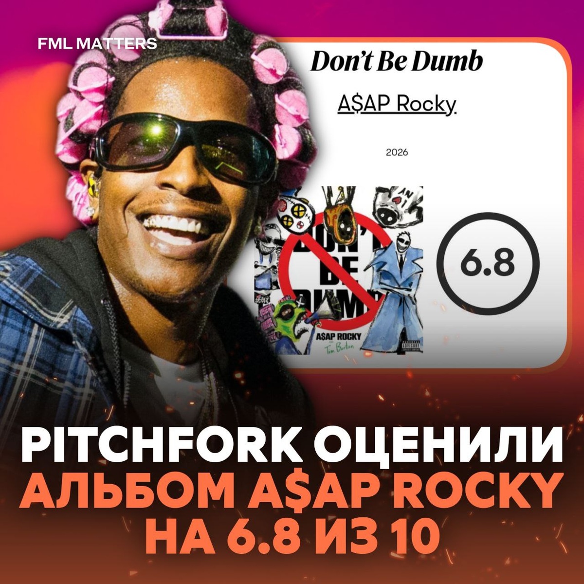 ✔️ 6.8 БАЛЛОВ ИЗ 10! PITCHFORK ОЦЕНИЛИ НОВЫЙ АЛЬБОМ A$AP ROCKY! Издание выставило оценку 6.8 из 10 четвёртому студийному альбому A$AP Rocky — «Don't Be Dumb». — Четвёртый альбом Роки не идеален, но умён. В нём есть достаточно изобретательности, чтобы доказать важность артиста для экосистемы рэпа. Для общего сравнения с другими оценками недавних альбомов: ➖ Che — REST IN BASS (8.3 баллов) ➖ OSAMASON — Jump Out (8.2 баллов); ➖ The Weeknd — Hurry Up Tomorrow (7.8 баллов); ➖ Tyler, The Creator — DON'T TAP THE GLASS (7.7 баллов) ➖ Playboi Carti — MUSIC (7.7 баллов); ➖ Ice Spice — Y2K (7.6 баллов); ➖ Tyler, The Creator — CHROMAKOPIA (7.6 баллов); ➖ LAZER DIM 700 — Sins Aloud (7.3 баллов) ➖ Ken Carson — More Chaos (7.0 баллов) ➖ Kendrick Lamar — GNX (6.6 баллов); ➖ EsDeeKid — Rebel (6.6 баллов); ➖ Peppa Pig — The Adventures Album (6.5 баллов); ➖ Clipse — Let God Sort Em Out (6.5 баллов) ➖ Pi'erre Bourne — Made In Paris (6.0 баллов) ➖ Drake, PARTYNEXTDOOR — $ОME $ЕXY $ОNGS 4 U (5.9 балло