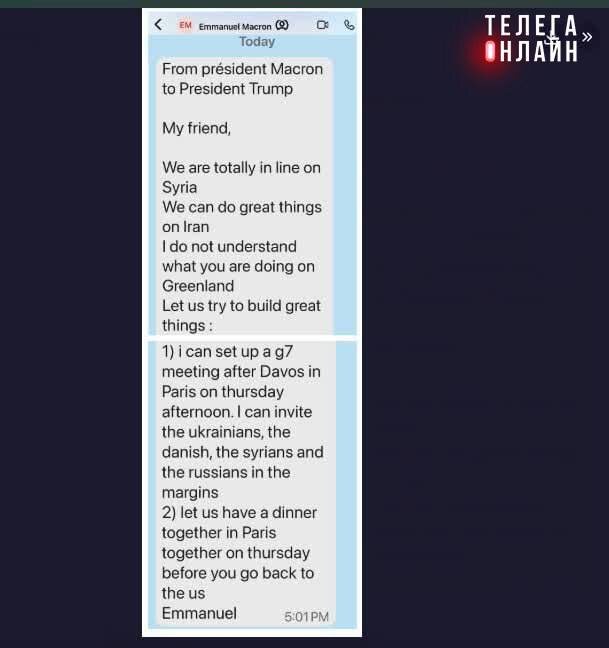 Трамп пообещал ввести 200% пошлины на французские вина и опубликовал личное сообщение от Макрона: Мой друг, мы полностью солидарны в вопросе Сирии. Мы можем многое сделать в отношении Ирана. Я не понимаю, что вы делаете по Гренландии. Давайте попробуем создать великие вещи: 1) Я могу организовать встречу G7 после Давоса в Париже во второй половине дня в четверг. Я могу пригласить украинцев, датчан, сирийцев и россиян в качестве наблюдателей. 2) Давайте вместе поужинаем в Париже в четверг, прежде чем вы вернетесь в США. Похоже, Дональд обиделся на Эммануэля за нежелание вступать в «Совет мира». 🚲 Подпишись на Телега Online