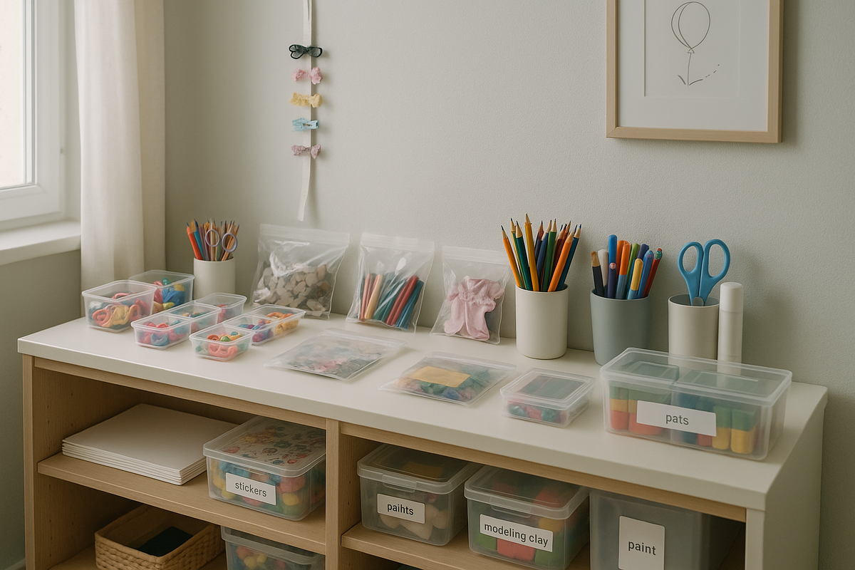 Чтобы не превращать уголок творчества в вечный хаос, разделите материалы по типам: