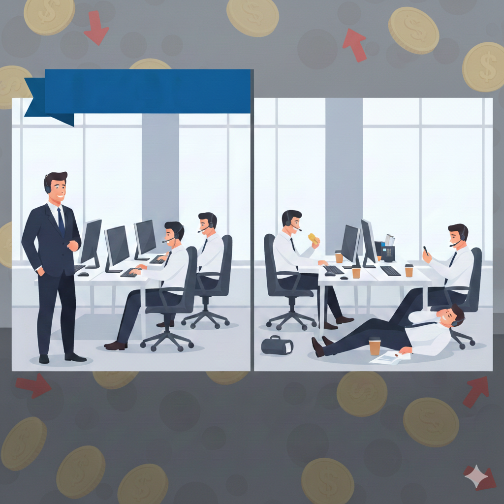 Когда владелец в офисе, в зале, на точке — сотрудники играют роль. Они делают так, как вы их учили. Улыбаются. Задают вопросы. Продают.