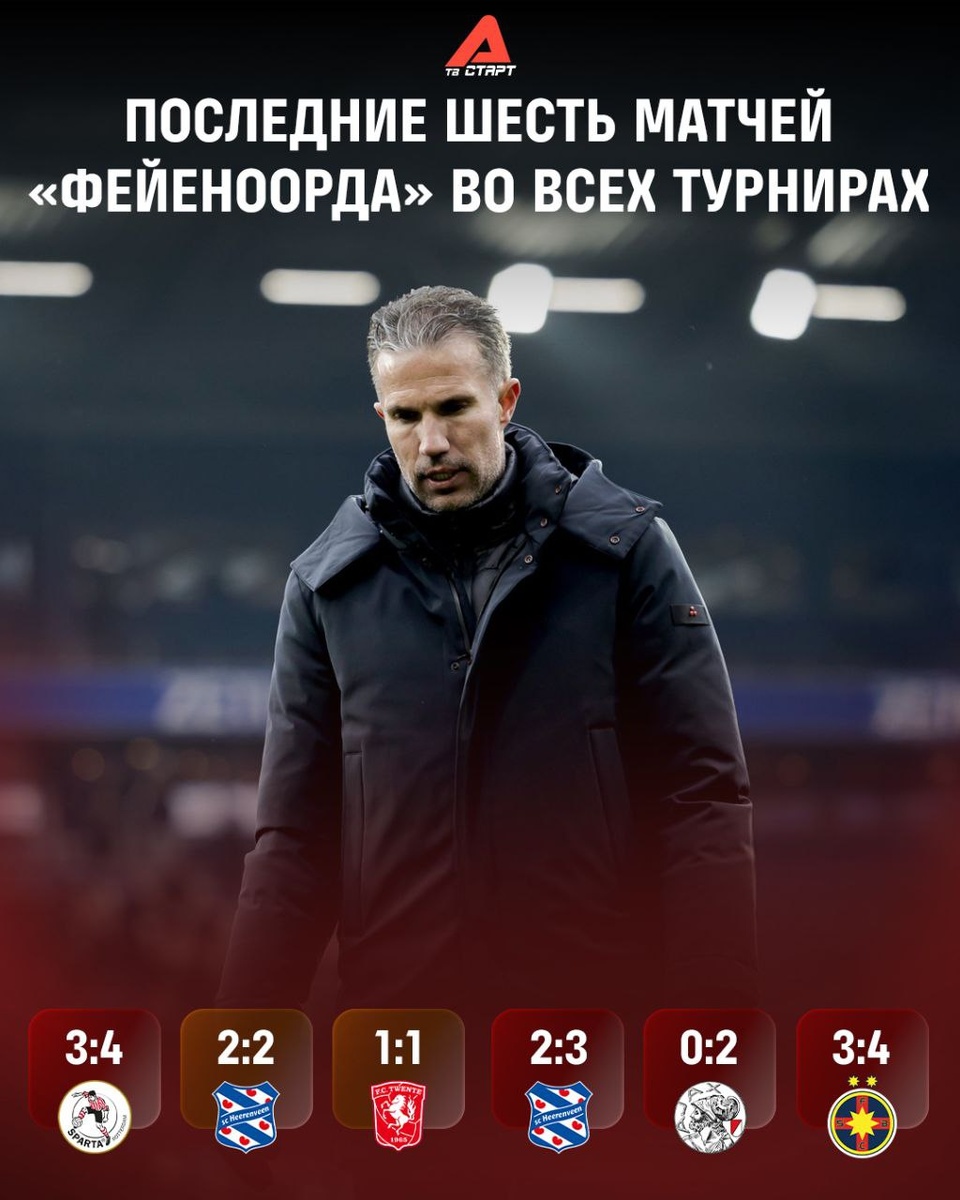 Неудачная серия «Фейеноорда» затянулась. Уступили «Аяксу», два раза проиграли со счетом 3:4, вылетели из Кубка, ну и пару ничьих тоже было. Что произошло с симпатичной командой Робина ван Перси? 😳 Подписывайся на ТВ СТАРТ в MAX📲