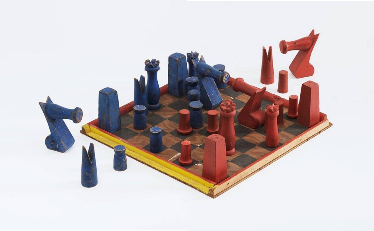 Великий скульптор сочинил три шахматных набора для выставки The Imagery of Chess в 1944 году — но именно тот что на картинке автор забрал домой для последующих игр. Собственно, по нему и видно. В наше время оный набор отсканировали и перевыпустили в рамках коллаборации Calder Foundation и Cahiers D’Art — продают по 2500 евро, но о материалах молчат. Дизайн — словно сельский ар-брют, грубоватый, детский, однако очень сбалансированный, всё по методу Колдера. Такими конями хочется играть чаще чем следует!