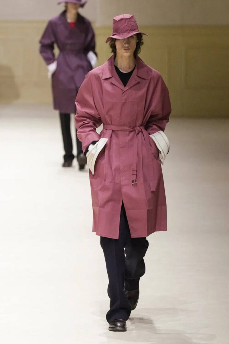 На этот раз Мучча Прада и Раф Симонс сосредоточились на очень узком силуэте, во многом характерном как раз для творчества Рафа. Центральной идеей в коллекции стало ощущение вещей с историей - вытянутые, высоко застёгнутые, почти аскетичные пальто выглядят так, будто их достали с пыльной полки старого шкафа. Помятости, заломы, потёртые манжеты, оголённые швы и кожа с эффектом износа стали основным приёмом в линейке. Этот аккуратный, почти строгий крой то и дело нарушался странноватыми деталями вроде словно приплюснутых и закреплённых на куртках шляп или укороченных технических накидок, стилизованных поверх классических тренчей. Больше в тгк Историк Мод Анатоль Вовк.