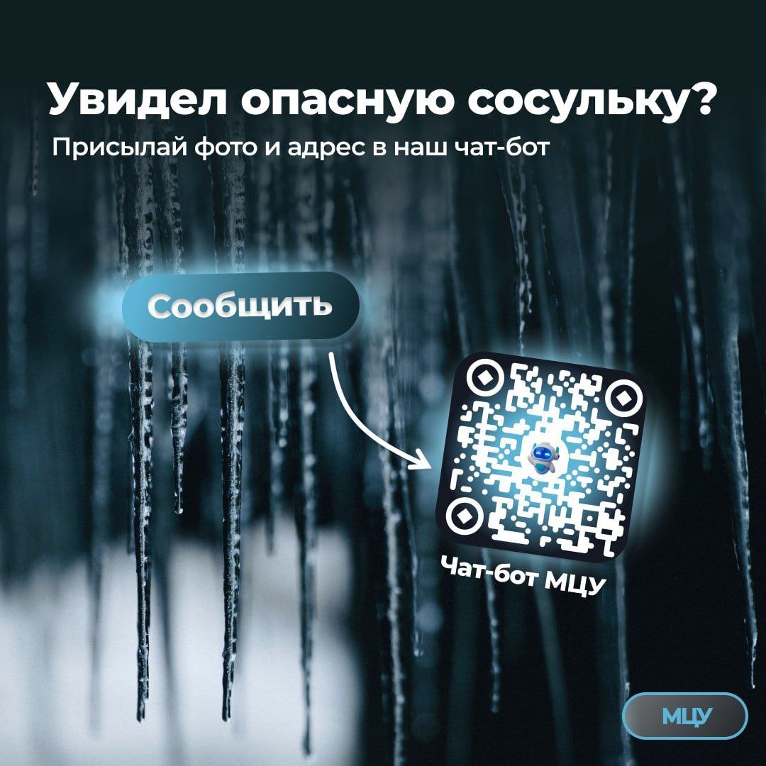 ❄️ Если вы заметили наледь на крыше, которая представляет угрозу для прохожих, напишите об этом в чат-бот МЦУ