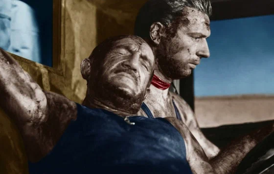 Плата за страх / Le Salaire de la peur. Франция-Италия, 1952. Режиссер Анри-Жорж Клузо. Актеры: И. Монтан, Ш. Ванель и др. Четверо отчаянных мужчин - француз, итальянец, немец и корсиканец нанимаются на работу водителями грузовиков, перевозящих опасный груз - нитроглицерин по бездорожью центральной Америки. Задание смертельно опасно, потому, что все может взорваться в любую минуту. Одну из ролей в этом фильме сыграл известный французский шансонье и актер Ив Монтан ("Признание", "Мания величия", "Дикарь"). Первая половина фильма посвящена развитию отношений героев. Вторая половина создает напряженную атмосферу ожидания исхода дела, по остроте не уступающую современным триллерам. В 1977 году американец Уильям Фридкин ("Французский связной", "Изгоняющий дьявола") поставил ремейк этого фильма под названием "Колдун". Но фильм Фридкина, в отличие от имевшей большой успех картины Клузо, провалился в прокате... Киновед Александр Федоров Пленник времени / Prisoner of Time. США, 1992. Режиссер