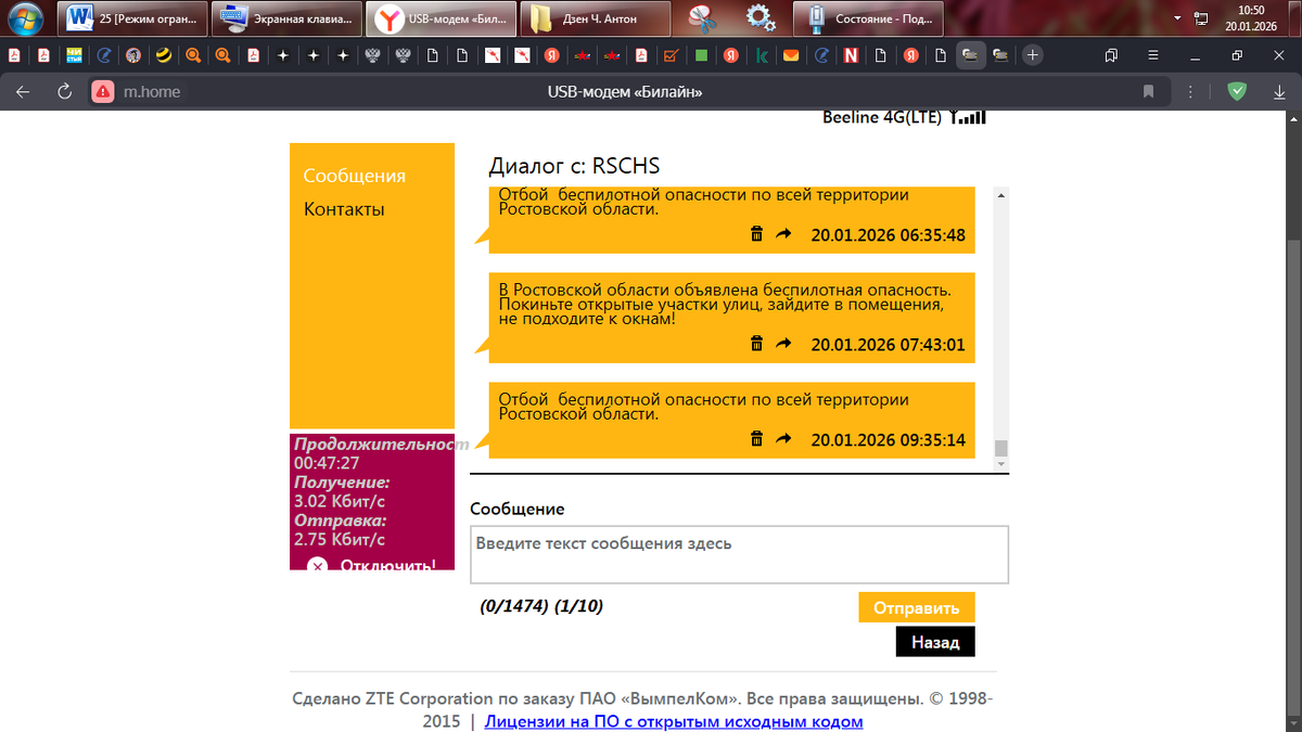 Получаю доступ на земле через World Wide Web (Всемирная Компьютерная Сеть) в информационно-телекоммуникационную сеть Internet («Интернет») и через соответствующую поисковую систему (браузер) на страницу сайта URL - адрес: http://m.home/index.html#home USB – модем «Билайн». В USB – модем «Билайн» вставлена сим-карта с абонентским номером +7 903 403 12 40. Так на настоящую сим-карту пришло СМС-сообщение следующее. - В Ростовской области объявлена беспилотная опасность. Покиньте открытые участки улиц, зайдите в помещения, не подходите к окнам! - 20.01.2026 07:43:01 - Отбой беспилотной опасности по всей территории Ростовской области. - 20.01.2026 09:35:14 Фотографию от 20.01.2026 г. СМС-сообщения прилагаю следующую. Приложение: 20 день месяца Января 2026 г. Чел. Антон М.К.