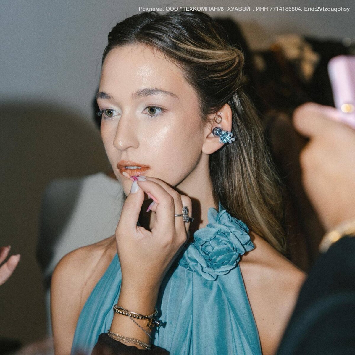 вписываются в образы. В этот раз в кадр попали HUAWEI FreeClip 2. Эти наушники использовали как часть луков моделей. Девайс выглядит нетипично: C-образная конструкция и клипсовая посадка делают их похожими на аксессуар, а не на привычные наушники. За счет этого они притягивают внимание и классно вписываются в повседневные образы. Со звуком тут все серьезнее, чем может показаться на первый взгляд. Излучатели с двумя диафрагмами дают мощные басы и плотные низкие частоты, а во время звонков голос остается чистым благодаря системе микрофонов и шумоподавлению. Наушники, кстати, совместимы как с Android, так и с iOS. Заряд держат более 9 часов, а с зарядным чехлом — около 38.