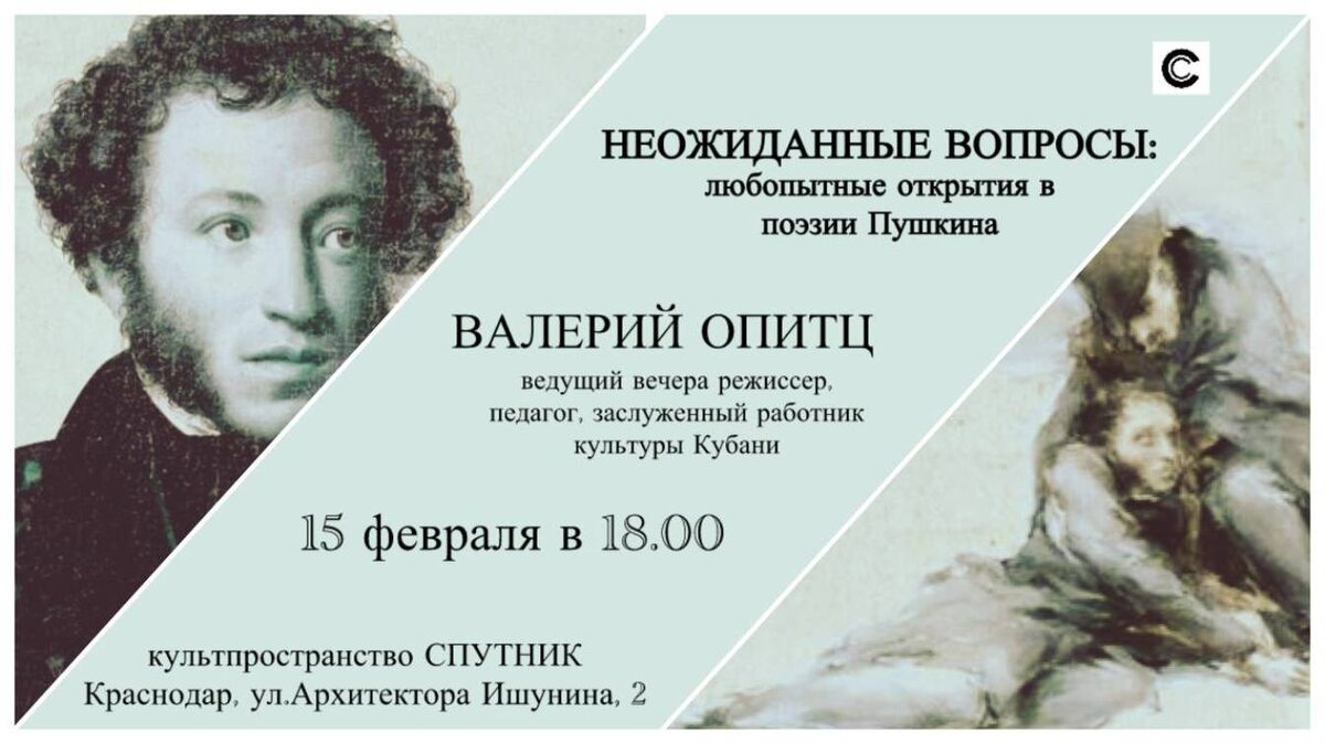 Предлагаем провести поэтическое свидание с «нашим всё»- Александром Сергеевичем Пушкиным. Будем расследовать судьбы персонажей, установливать причины их поступков, определять даты происходящих событий, обнаруживать удивительное в хрестоматийном. Иначе говоря, вместе поищем вопросы, ответы на которые могут принести удовольствие открытий, окунемся в чарующий мир поэзии А. С. Пушкина и протестируем небанальные гипотезы весело и азартно! Ведущий вечера — заслуженный работник культуры Кубани, профессиональный, режиссёр, талантливый педагог и удивительный рассказчик ВАЛЕРИЙ ОПИТЦ