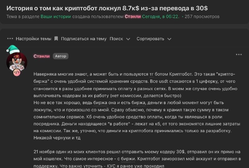 $. На форуме всплыла поучительная история: чел закинул депозит в 30$ с высоким AML, а при общем балансе в 8763$ бот просто взял и залочил ему счёт. Пострадавший написал в саппорт, заново прошёл KYC и… после этого поддержка ушла в полный игнор. Через пару дней он даже написал напрямую CEO CryptoBot — Марку, отдав 1 000 Telegram Stars за сообщение, но ответа так и не дождался. В итоге классика жанра: деньги зависли, саппорт молчит, удивлённых ноль. Подробнее: https://hard-tm.su/threads/141662/ 🕹HARD-TM — Подписаться