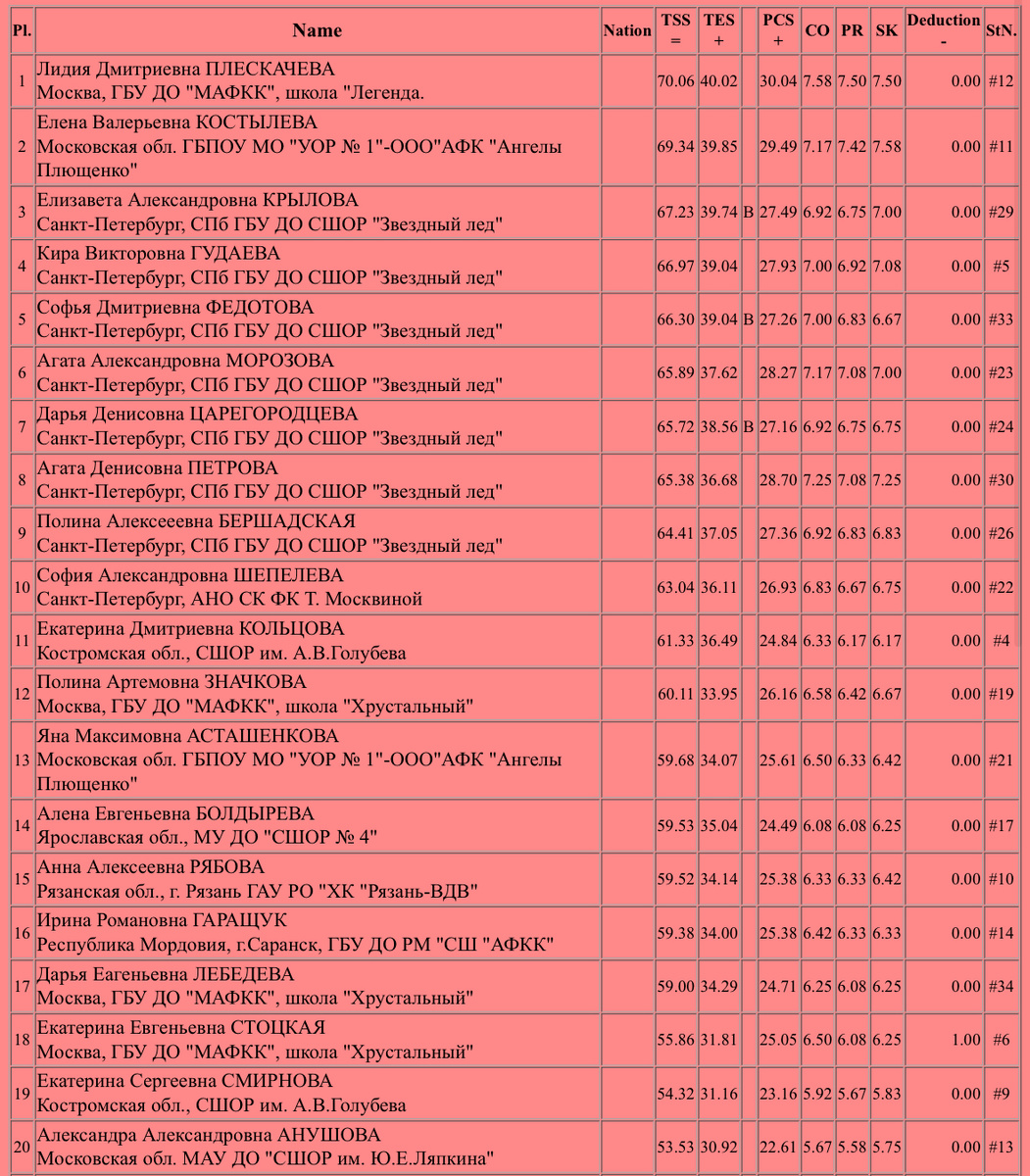 Соревнования «Памяти П. С. Грушмана». Юниорки, короткие программы. Плескачёва лидирует. Костылева — вторая, Крылова — третья