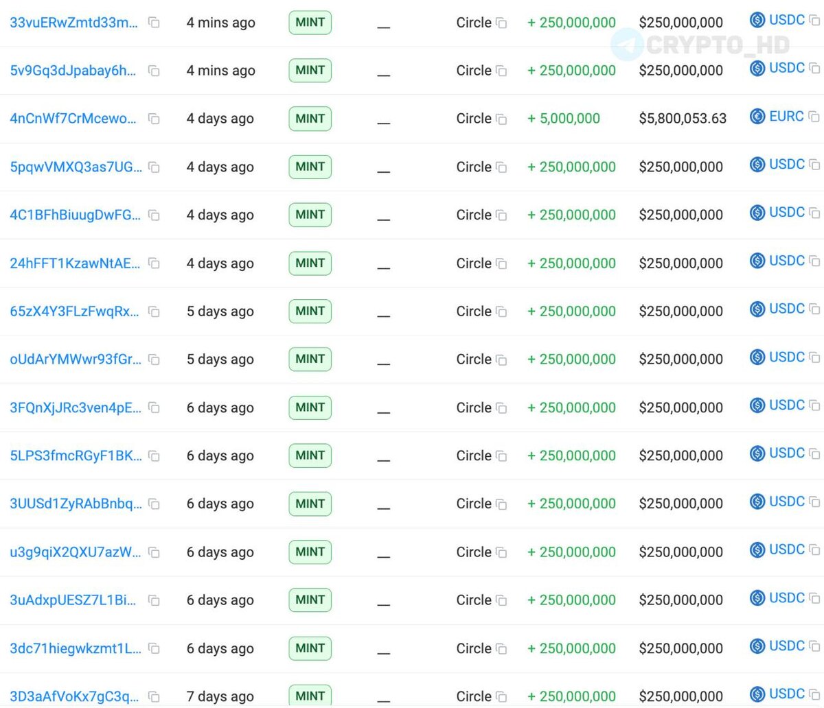 🤔 В Circle напечатали #USDC уже на $7,500,000,000 с начала этого года. Сегодня: +500,000,000 USDC. …возможно, это те самые «новые деньги» необходимые для начала альтсезона (но это не точно). Crypto Headlines