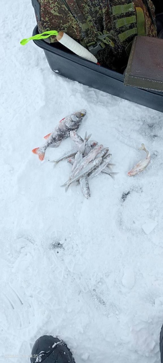 📍 Курорт↔️Сестрорецк 🌊 Финский залив 🎣 Зимняя удочка Поехали уже с товарищем. Час по льду до места, 10м глубина, лед 20см, ловили на карася и пробовали на ерша. На ерша плохо. Погода не радовала: ветер Ю/З с ледяным туманом, куда выходить не видно, шли обратно по навигатору. В итоге: корь по 10шт на брата, я зацепил приловом хорошего матросика, ну и ерш)