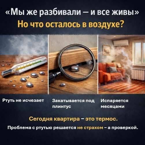 ». Почему это не аргумент Мы тоже в детстве разбивали градусники. И да — вроде бы все живы. И это правда. Ртуть не взрывается, не убивает за 5 минут и не пахнет. Но проблема не в этом. Проблема в том, что происходит с ртутью после. 🫠 Когда градусник разбивается, ртуть: — не исчезает — распадается на десятки микрошариков — закатывается под плинтусы, в щели, в ковры И дальше она испаряется месяцами. Вы этого не видите. Вы этого не чувствуете. Но вы этим дышите. 🙄 «Но раньше же ничего не было» Раньше: — не было тёплых полов — не было герметичных окон — не было постоянного отопления Сегодня квартира — это термос. Пары ртути не уходят. Они накапливаются. По замерам, в большинстве квартир превышение ПДК паров ртути сохраняется даже через 2–3 дня после “уборки веником”. Самое важное Мы не говорим, что вы обязательно отравитесь. Мы говорим, что никто не знает, сколько ртути осталось именно у вас. И вот ключевая мысль: Проблема с ртутью решается не страхом — а проверкой. Если ра