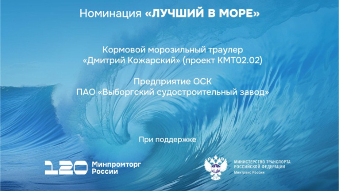 Траулер "Дмитрий Кожарский", построенный на Выборгском судостроительном заводе ОСК в 2023 году, вошёл в топ лучших судов России по версии Первой национальной премии морской отрасли "Морской Олимп" в номинации "Лучший в море". Судно предназначено для Группы Компаний "ФОР" и в настоящее время успешно работает на промысле в Северной Атлантике. Кормовой морозильный траулер проекта КМТ02.02 развивает скорость до 15 узлов в балласте, может размещать на борту 46 человек, включая госпиталь, и автономно действовать до 30 суток. На судне установлено оборудование для вылова и переработки рыбы с плановой производительностью до 150 тонн в сутки, а комбинированные трюмы позволяют хранить до 2375 куб. м морской продукции. Несмотря на сравнительно небольшие размеры, "Дмитрий Кожарский" обеспечивает полный цикл переработки: от улова траловым комплексом, обработки в рыбообрабатывающем цехе и хранения замороженной продукции до её отгрузки готовой к реализации, отметили в пресс-службе Выборгского судостро