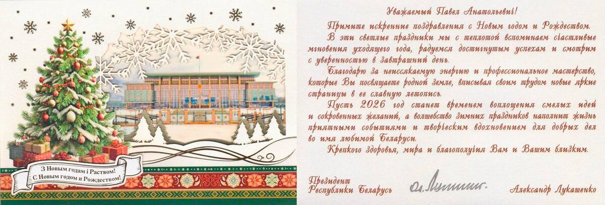 30 декабря 2025 г. Заместитель директора по научной работе Павел Анатольевич Трубчик получил персональное новогоднее поздравление от Президента Республики Беларусь Александра Григорьевича Лукашенко! Мы все знаем, сколько сил и энергии Павел Анатольевич отдаёт работе, и очень рады, что этот труд замечен на таком высоком уровне. По сути, это почётная оценка работы всего нашего дружного коллектива. Спасибо вам, коллеги, за общий вклад, который делает институт сильным и значимым!