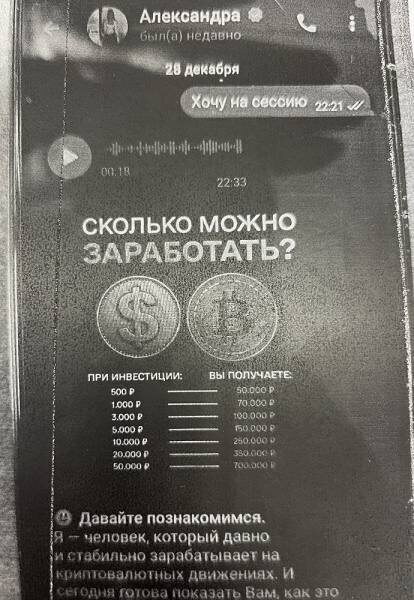Она увидела рекламу инвестиций в мессенджере и решила попробовать вложить всего 500 рублей. Сначала ей сказали, что заработала 50 тысяч, но для вывода денег нужно заплатить налоги и сборы. Постепенно сумма выплат выросла, пока девушка не поняла, что её обманывают. Полиция начала расследование и ищет виновных.