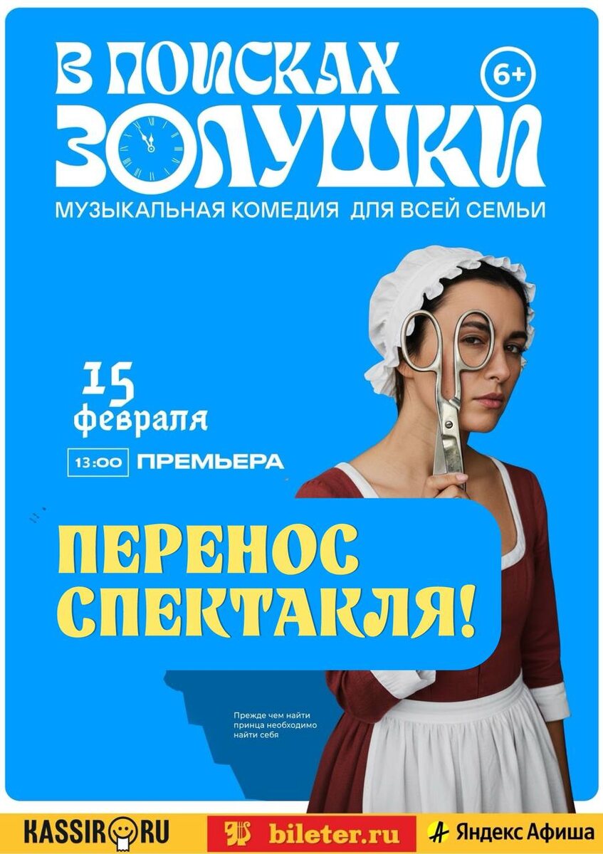 ! В связи с болезнью актёра мы вынуждены перенести спектакль «В поисках Золушки» с 31 января 13:00 на 15 февраля 13:00 Все билеты остаются действительными, места уже сохранены за вами! Приносим извинения за доставленные неудобства 🙏 Мы переносим спектакли только в крайних случаях и, как только нам стало известно о ситуации, сразу постарались максимально оперативно вас оповестить. На вашу электронную почту придёт письмо с информацией о переносе и возможностью возврата билетов. Обращаем ваше внимание: все остальные спектакли театра состоятся в назначенное время: 30 января "Страна возможно" https://clck.ru/3RN7Nn 31 января "Новая помада" https://clck.ru/3RN6Vd 1 февраля "Монологи Богини" https://clck.ru/3RN6QV 15 февраля «В поисках Золушки» https://clck.ru/3RN5e7