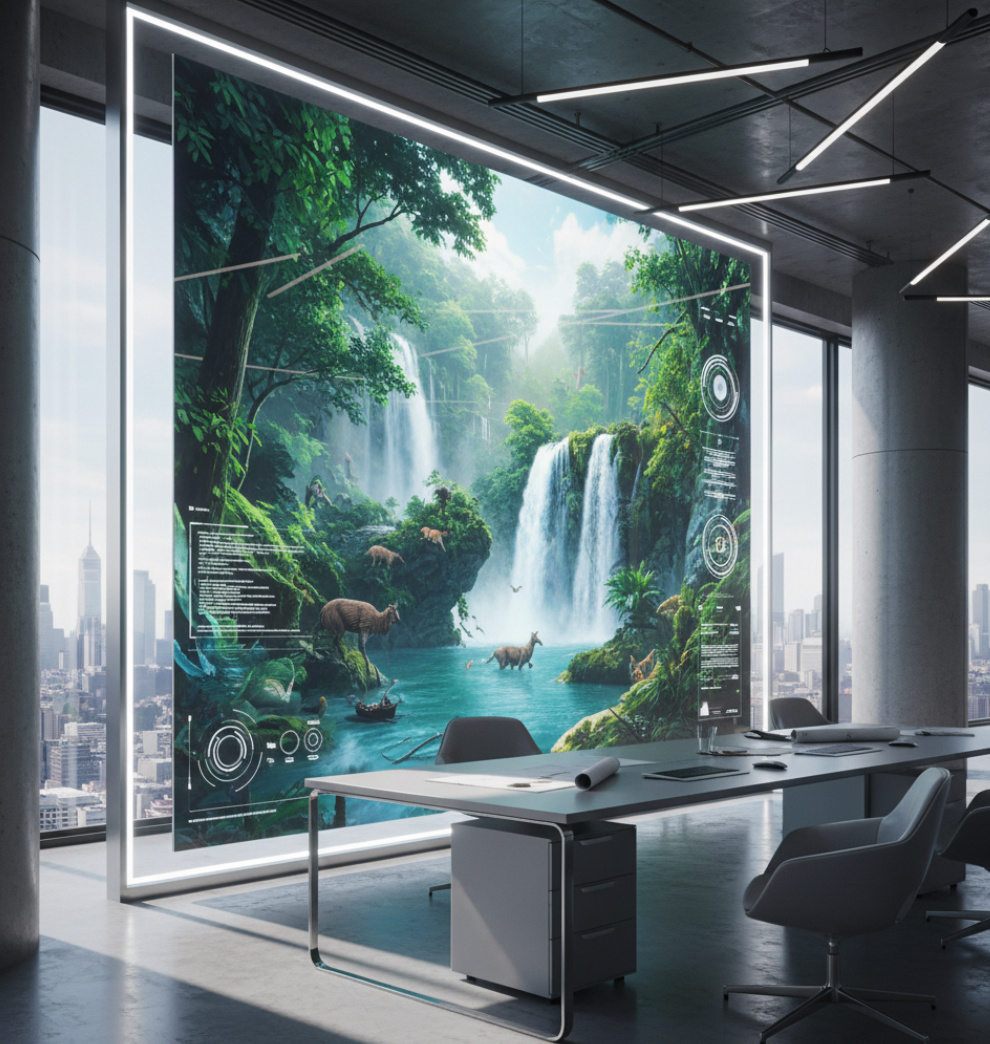 Обычное стекло превращается в огромный прозрачный сенсорный дисплей. Когда выключено — просто окно, когда включено — показывает погоду, календарь, 4K-видео природы или управляет умным домом. Жесты, голос — всё работает. Идеально для минималистичной квартиры или офиса в Москве или Питере.