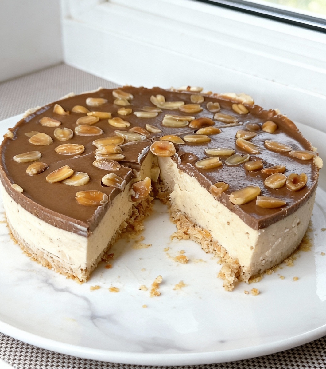 Арахисовый чизкейк с нежным творожным слоем и шоколадной глазурью.