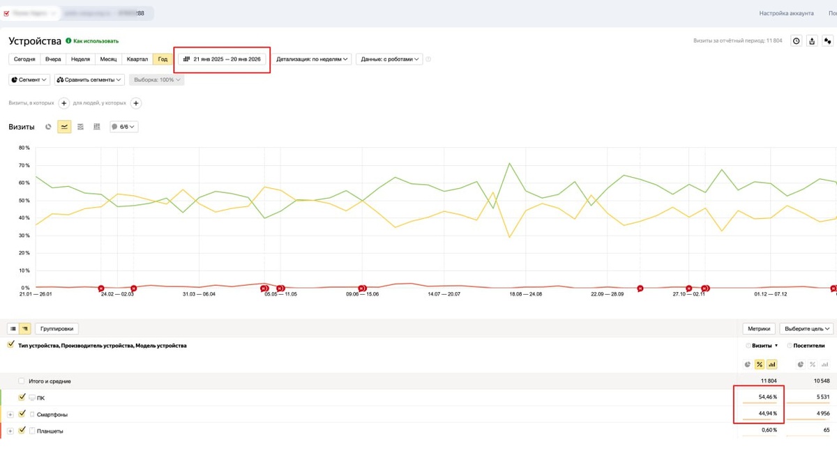 Даже сейчас есть ниши и проекты, где сайт смотрят больше с десктопа, чем с мобильного. Причём не «чуть-чуть больше», а стабильно. Ещё один маркер — время заходов. Основной трафик: будни, с 09:00 до 18:00. Вечером и в выходные — резкий спад. Это почти всегда B2B: — решения принимают в рабочее время — сайт открывают с компьютера — читают, а не пролистывают — возвращаются по нескольку раз В таких проектах аналитика выглядит предсказуемо: — длинные сессии — меньше хаотичных кликов — выше доля возвратов — вкладки «живут» часами Никаких выводов. Просто факт. Так, что не забивайте на десктоп =)