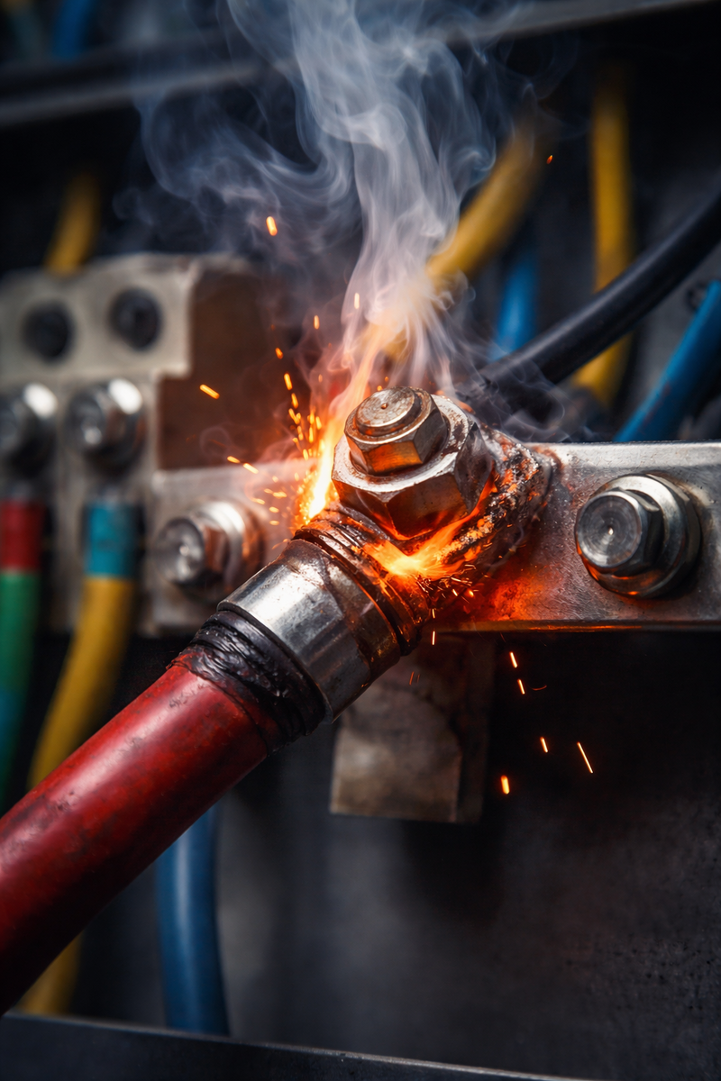 Перегрузка понятна любой защите: вырос ток — автомат отключил линию. Нагрев без превышения тока защита не видит. Узел может месяцами работать в штатных амперах, но температура в одной точке уже превышает предел изоляции и металла. Авария наступает не «в момент перегрузки», а в момент разрушения контакта. Нагрев чаще связан с ростом переходного сопротивления, а не с увеличением тока. Достаточно ухудшения контакта на доли миллиома, чтобы при штатной нагрузке возникала локальная точка в 120–160 °C. Приборы показывают норму, потому что измеряют ток линии, а не состояние болта или наконечника. Именно здесь тепло не распределяется, а концентрируется в одной точке. Циклические пуски, частые включения бойлеров, лифтов, компрессоров вызывают микроподвижность контакта. Соединение «дышит», появляется оксидная плёнка, сопротивление растёт ещё сильнее. В спокойные часы узел холодный, в пики — выходит за пределы, поэтому регламентные замеры ничего не ловят. Эксплуатация ориентируется на ток и автома