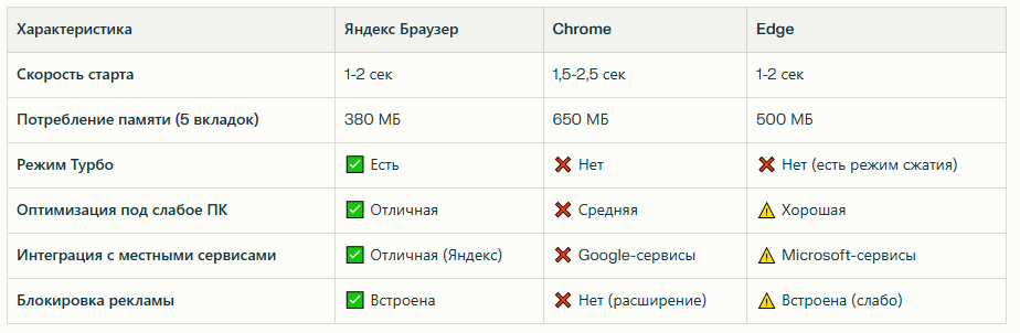 Браузер5 открытых вкладокПК с 2 ГБ RAMGoogle Chrome~650 МБНачинает тормозитьЯндекс Браузер~380 МБРаботает нормальноРазница270 МБChrome требует на 42% больше