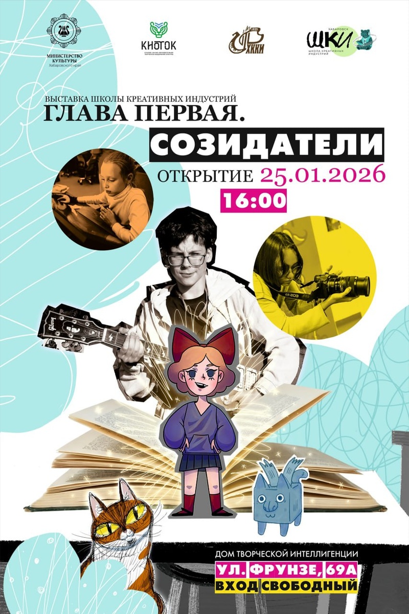 СОЗИДАТЕЛИ» ✔ Отчётная выставка учеников Первой Школы креативных индустрий в Хабаровском крае и Хабаровского краевого колледжа искусств ✔ Направления Школы: анимация, фото- и видеопроизводство, звукорежиссура ✔ Также представлены проекты студентов колледжа по направлениям «Живопись» и «Дизайн» (набор/направления открыты в 2025) ✔ Интерактивный формат: QR-коды к видео- и аудио-контенту, созданному учениками 📅 Когда: #25_января, 16:00 (открытие) ⛳ Где: Дом творческой интеллигенции, ул. Фрунзе, 69а (Хабаровск) 💳 Вход свободный 👉 Афиша Хабаровска. Куда сходить, экскурсии