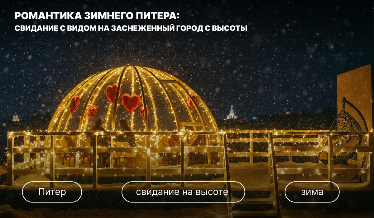 Романтическое свидание зимой в Петербурге – это всегда немного о кино, немного о магии и совсем чуть-чуть о безумии, когда двое добровольно выбирают ветер, снег и высоту, чтобы запомнить этот вечер навсегда. Заснеженный город внизу превращается в декорацию: огни Невы, мосты, шпили и купола выглядят так, будто их специально нарисовали для чьей‑то личной истории любви. Питер умеет быть разным, но зимой он особенно красив, если смотреть на него сверху и изолировать от сырости, луж и суеты улиц. Высота создаёт ощущение, что мир на время остановился: внизу транспорт, люди и хлопоты, а наверху только вы двое, тишина, огни и снег, который мягко ложится на крыши. Такое свидание автоматически становится «особенным» в памяти: даже если вы просто пьёте чай или игристое, атмосфера панорамного пространства делает любой жест глубже и значимее. Для многих пар именно вид на город становится тем самым фоном, на котором рождаются важные разговоры, признания и даже предложения руки и сердца. Зимой Са