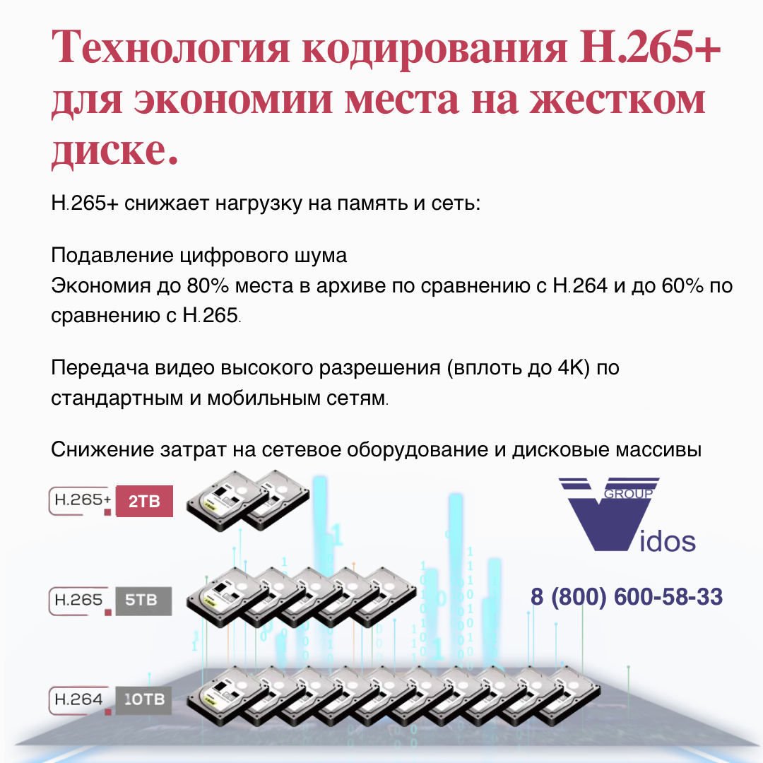 Трафик распределяется гибко: больше — при движении, меньше — в статике. Снижается нагрузка на сеть и диски. 📌 Что вы получаете? ✅ Экономия места — до 80% по сравнению с H.264, до 60% по сравнению с H.265