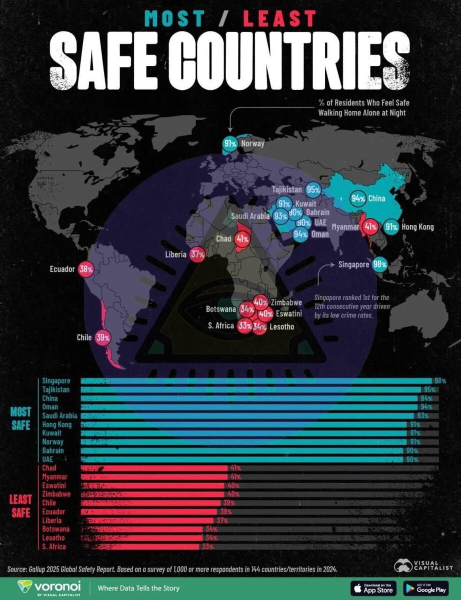 Наткнулся тут на ещё один красивый пример - почему не стоит инвестировать в зарубежье, а деньги должны работать по принципу "где родился - там и пригодился" Смотрите картинку - самые безопасные страны мира по опросу Gallup. Вверху - страны где люди спокойно гуляют ночью в одиночку, а внизу - где постоянно оглядываются через плечо Для того, кто смотрит на недвижимость как на актив, здесь прямая зависимость. Безопасность - это не просто приятный бонус, это фундамент, на котором строятся цены. Чем спокойнее люди себя чувствуют, тем больше они готовы платить за квадратные метры. Это базовый, почти инстинктивный запрос. И задача инвестора найти страну, где фактор безопастности начинает свой рост, так как вслед за ним надо ждать роста стоимости недвижимости Посмотрим на график. На самой вершине с большим отрывом Сингапур - 98% жителей чувствуют себя в полной безопасности. И это не разовый успех, а стабильное лидерство на протяжении 12 лет. Следом идут... что?😲 Таджикистан?? К Китаю, ОАЭ, Но