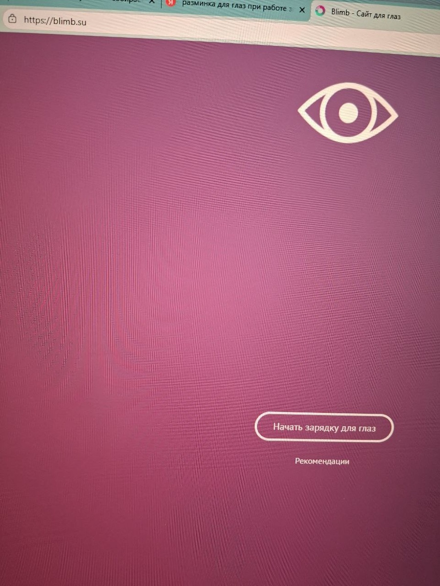: 1. Часто моргайте. Даже во время пользования компьютером/телефоном. Мы часто забываем моргать, когда сосредоточены. Дышать, кстати, тоже не забывайте - кровообращение в глазах лучше будет; 2. Позаботьтесь об освещении места работы. 3. Расстояние до монитора - не менее 50 см. 4. Помещение должно вентилироваться, и влажность должна быть достаточной. Нормальная влажность - 40-60%. Особенно трудно добиться этого зимой, но это очень важно. 5. Чтобы побороть усталось глаз, есть много вариантов упражнений, доступных на просторах интернета. Отдельно хочу выделить сайт blimb (на фото), там удобно просто нажать кнопочку и двигать глазами, как показано. Раз в час сайт дает уведомление, что пора повторить разминку. 6. Мне очень понравилась книга Мирзакарима Норбекова "Опыт дурака, или ключ к прозрению". Там автор дает необычные советы и упражнения для восстановления зрения. Книга будет полезна даже тем, кто не имеет проблем со зрением😁 Как у вас, болят ли глазки после работы или от тел