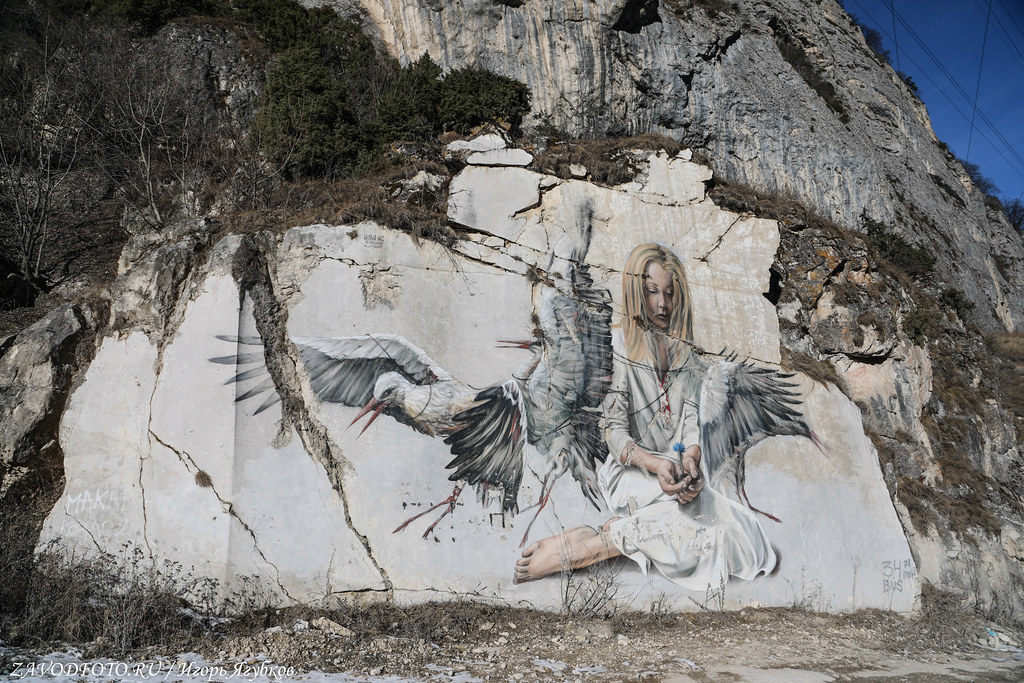 У перевала Кахтисар в пригородном районе Северной Осетии-Алании можно увидеть довольно интересные граффити. Там вдоль крутого серпантина протяженной дороги десять стрит-художников со всей России создали работы прямо на срезах доломитовых скал. Скалы перевала Кахтисар теперь украшают: девушка с аистами, люди с домами вместо головы, даже голубой запорожец в сугробе. Вся эта красота была сделанв в рамках фестиваля Back to the Roots, который прошел в 2021 году. Фестиваль завершился в Международный день дружбы - 30 июля состоялось открытие арт-объектов и презентация работ художников. Это место стало самой большой легальной галереей граффити на Северном Кавказе. «Снег начнется» (Александр Демкин из Рязани). К этому проекту приложили руку: дуэт уличных художников Ильи Ис и Артема Бурж из HoodGraff, а с ними Стас Багс, Костя Ужве, Миша Верт. Всего, как я уже сказал выше, 10 граффитчиков из стран СНГ и столько же работ, пропитанных уникальной национальной культурой. Девочка с танцующими журавля