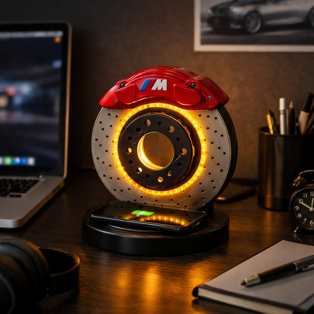 Один из вариантов, который неожиданно хорошо вписывается в интерьер — настольная LED-лампа в форме тормозного диска BMW M-серии.