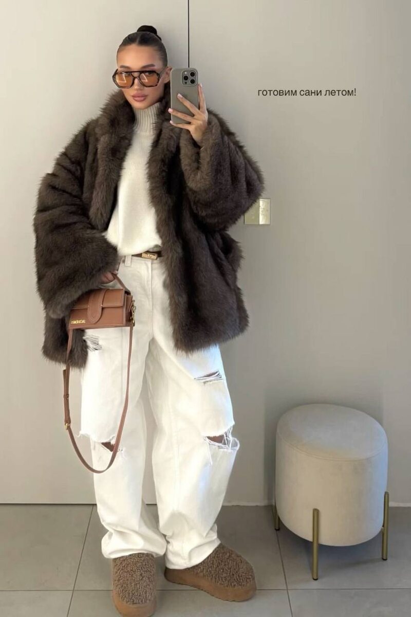 Этот образ — наглядный пример того, как люкс и casual могут звучать в одном настроении, не споря друг с другом. 🤍Объёмная шуба глубокого коричневого оттенка сразу задаёт статус и тепло. Она мягкая, фактурная, визуально дорогая — и при этом не требует сложных сочетаний. 🤍Под ней — молочный свитер с высокой горловиной: чистая база, которая уравновешивает объём и делает образ спокойным. 🤍Белые джинсы с рваными деталями добавляют расслабленности. За счёт контраста фактур образ не выглядит «слишком аккуратным» — появляется характер. 🤍Обувь в уютной, почти домашней эстетике усиливает ощущение комфорта и делает лук максимально носибельным. 🤍Сумка тёплого оттенка и очки с массивной оправой собирают образ в единое целое и добавляют финальный акцент. Это стиль для тех, кто ценит комфорт, визуальную мягкость и уверенную подачу. Не про демонстрацию трендов, а про ощущение себя — спокойно, дорого и очень актуально. Все ссылки на альтернативный образ тут👇 Шуба Свитер Джинсы Ремень Обув